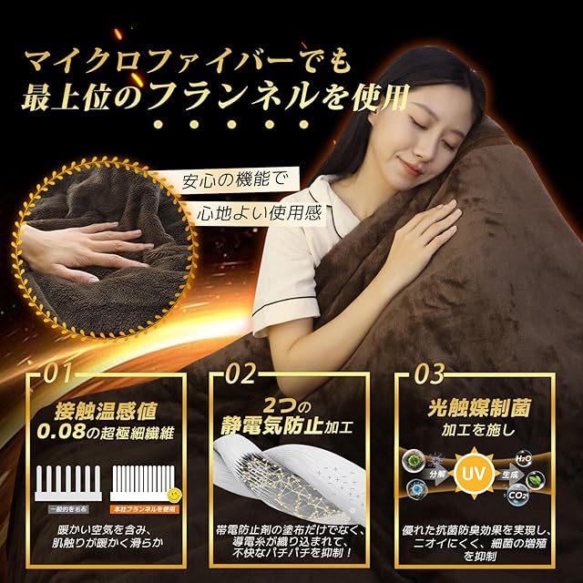 【接触温感・ダブル静電気防止効果】毛布の表裏地には、接触温感値0.08の「フランネル扁平糸」超極細繊維が使用されて、手触りが暖かく滑らかで、8mmの毛足によりたくさん暖かい空気を含み、温かい空気層を形成します。5cmごとに導電糸が生地に織り込まれて、静電気を効果的に除去します。さらに帯電防止剤加工が施されているため、ダブル静電気防止効果になり、乾燥した季節でも嫌いなパチパチから解放され、安心できます。