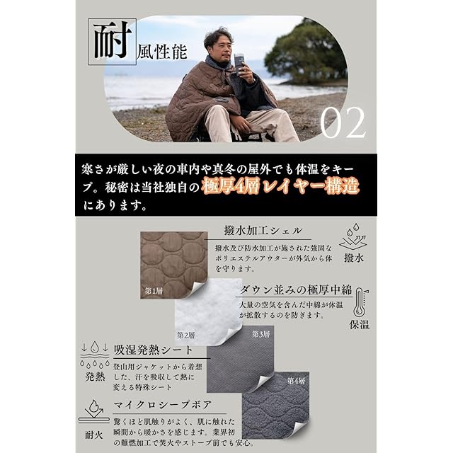 【耐寒、耐風性能】ブランケットのアウターシェルには耐風性能に優れた40Dポリエステルを使用。更に4層の断熱層が体温を外に逃しません。弊社実験では氷点下の環境下でもブランケット内の温度は25℃の快適温度帯を保ちました。