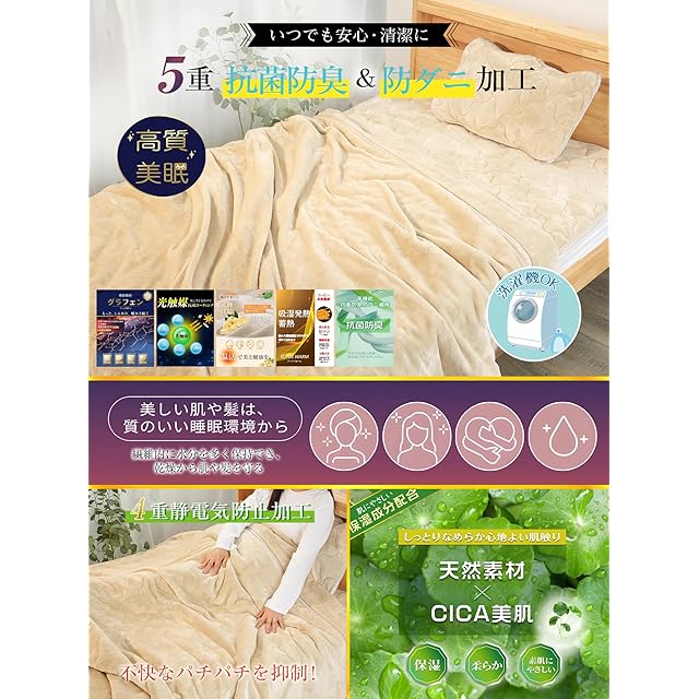 【4重静電気防止×CICA保湿加工で『高質美眠』を実現!】①表生地には導電性繊維が混合されており、静電気によるパチパチ感を軽減させ、ホコリや花粉等が付きにくくなっています。②生地基布に優れた電気伝導性も備えているグラフェン素材を採用。グラフェンを配合した生地は最高レベルの静電気防止性能を実現できます。③放電を促す帯電防止剤を塗布することで、あったか起毛素材に起こりがちなパチパチ感を抑制。④韓国美容でも話題の、肌荒れを防ぐ「天然由来の保湿成分」CICA(ツボクサエキス)を配合することで、繊維内に水分を多く保持でき、保湿効果を高めています。睡眠時の摩擦や乾燥から肌や髪を守り、お肌のケアと良質の睡眠を同時にかなえることができます。洗濯を繰り返しても効果は持続。