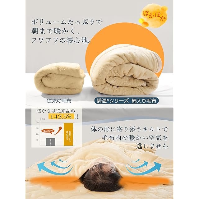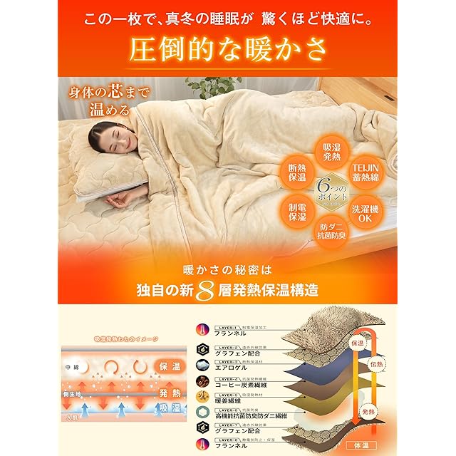【一晩中持続する暖かさの秘密】は、研究に研究を重ね、こだわりぬいた独自の「新8層発熱保温断熱構造」です。①この瞬温シリーズ冬用あったか毛布の表層には、驚くほどなめらかな肌触りのマイクロファイバーを使用、ふわっと素肌に触れるたびに、極上の気持ちよさにとろけてしまうほど。②生地基布に「遠赤外発熱」「熱伝導性」「蓄熱保温」「抗菌防臭」特性を備えている奇跡のグラフェン素材配合しています。③『贅沢に詰め込んだのは、特別な中わた』の上層には、宇宙服に採用されている次世代断熱材『エアロゲル』層×「吸湿発熱」「蓄熱保温」「遠赤外発熱」「永久消臭」の特性を持ち、環境にもやさしい素材『コーヒー炭素繊維』を採用、中わたの下層には天然ショウガ成分配合の吸湿発熱新素材『暖姜繊維』と高機能抗菌防臭防ダニ繊維を採用しています。④「吸湿発熱」×「遠赤外線発熱」のわたが、寝ている間の汗を吸って暖かさに変え、しかもムレにくくなっているので、より保温性が高くなっています。圧倒的な暖かさを効率よく毛布全体に伝えて循環させるから、寒い冬でもあたたかさが保てます。