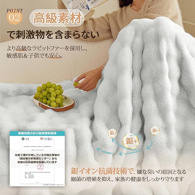 【銀イオンブランケット】ATOPEN毛布には銀イオンを配合しているため、殺菌機能が備わっています。ニオイの原因となる細菌の繁殖を防ぐので、お子様やペットがいるご家庭でも安心。さらに、安全性テストも通過済みなので、より一層ご安心いただけます。