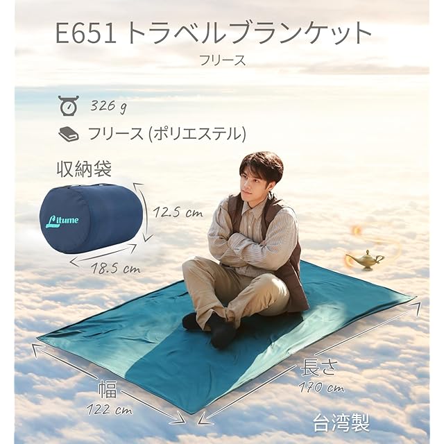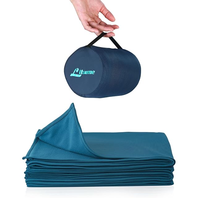 Litume 170 x 122 cm 柔らかい 防災 飛行機 旅行用ブランケット ブランケット 折り畳みデザインと専用収納ポーチ付き 電車、キャンプ、バックパッキングと旅行に最適 フリース ティール