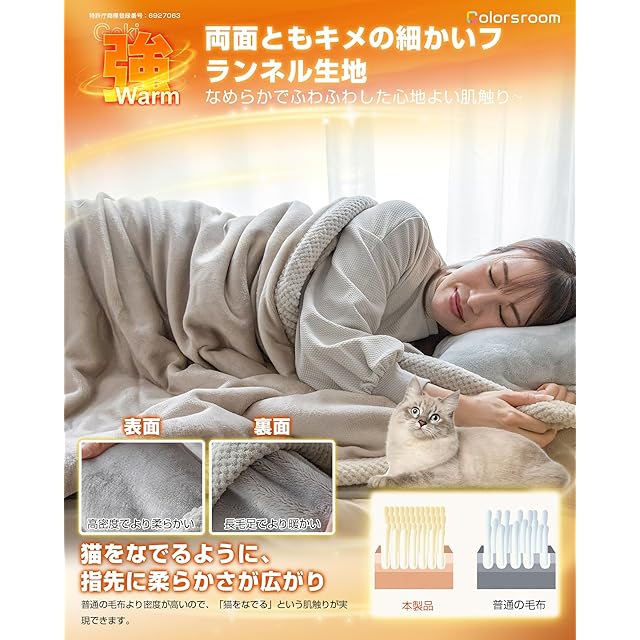 【Wリバーシブル・2倍温か両面フランネル】表面は極細フランネルで、なめらかな肌触りとふんわり温かさを実現。裏面は約2.5倍の超長毛フランネルを採用し、羊毛並みの保温性で一晩中ぽかぽか持続!静電気99%抑制加工で、乾燥季節もパチパチせず、快適にお使いいただけます。季節や気分で表裏を使い分けて、オシャレで温かいくつろぎタイムを。