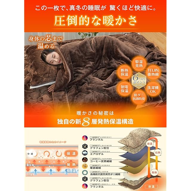 【一晩中持続する暖かさの秘密】は、研究に研究を重ね、こだわりぬいた独自の「新8層発熱保温断熱構造」です。①この瞬温シリーズ冬用あったか毛布の表層には、驚くほどなめらかな肌触りのマイクロファイバーを使用、ふわっと素肌に触れるたびに、極上の気持ちよさにとろけてしまうほど。②生地基布に「遠赤外発熱」「熱伝導性」「蓄熱保温」「抗菌防臭」特性を備えている奇跡のグラフェン素材配合しています。③『贅沢に詰め込んだのは、特別な中わた』の上層には、宇宙服に採用されている次世代断熱材『エアロゲル』層×「吸湿発熱」「蓄熱保温」「遠赤外発熱」「永久消臭」の特性を持ち、環境にもやさしい素材『コーヒー炭素繊維』を採用、中わたの下層には天然ショウガ成分配合の吸湿発熱新素材『暖姜繊維』と高機能抗菌防臭防ダニ繊維を採用しています。④「吸湿発熱」×「遠赤外線発熱」のわたが、寝ている間の汗を吸って暖かさに変え、しかもムレにくくなっているので、より保温性が高くなっています。圧倒的な暖かさを効率よく毛布全体に伝えて循環させるから、寒い冬でもあたたかさが保てます。
