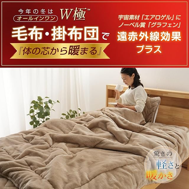 【一枚2役 多機能ラグジュアリー冬用毛布掛け布団】ノーベル賞を受賞した奇跡の素材『グラフェン』とNASA宇宙服素材『エアロゲル』、この二つの最先端テクノロジー素材をメインに、高機能抗菌防臭中わたなど機能が異なる4種のハイテク中わたを採用した毛布 掛け布団です。側生地には、伝統的な高級毛布に使われているニューマイヤ生地を採用し、魔法瓶効果によって外からの冷気をシャットアウトし、体温を反射して温かさを保つアルミ蒸着加工を施した特殊中材で挟んだ、6層構造の冬用厚手毛布です。一般的毛布よりも大きめサイズで、四隅に布団カバー用のループが付いており、冬用掛け布団としてもお使いいただけます。軽量でありながら、宇宙クラスの暖かさを実現しています。