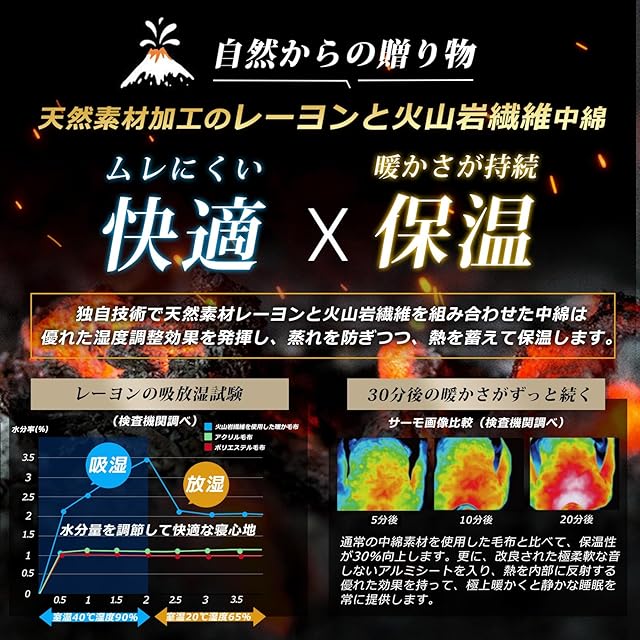 【驚く吸湿発熱力と蓄熱保温力の秘密:レーヨン&火山石入り中綿】毛布の中綿は、レーヨンと火山岩繊維の混合素材で作られています。レーヨンは天然素材で、体から放出される湿気を素早く吸収し、熱に変える一方、火山岩繊維はその熱を捕らえ、毛布内にしっかりと閉じ込めます。通常の中綿素材を使用した毛布と比べて、保温性が30%向上します。二つの素材の上手に組み合わせにより、毛布の湿度の調整効果を最大に発揮し、蒸れを防ぎつつ、熱を蓄えて保温できます。極上の快適さと暖かさを持続的に提供する高級毛布です。