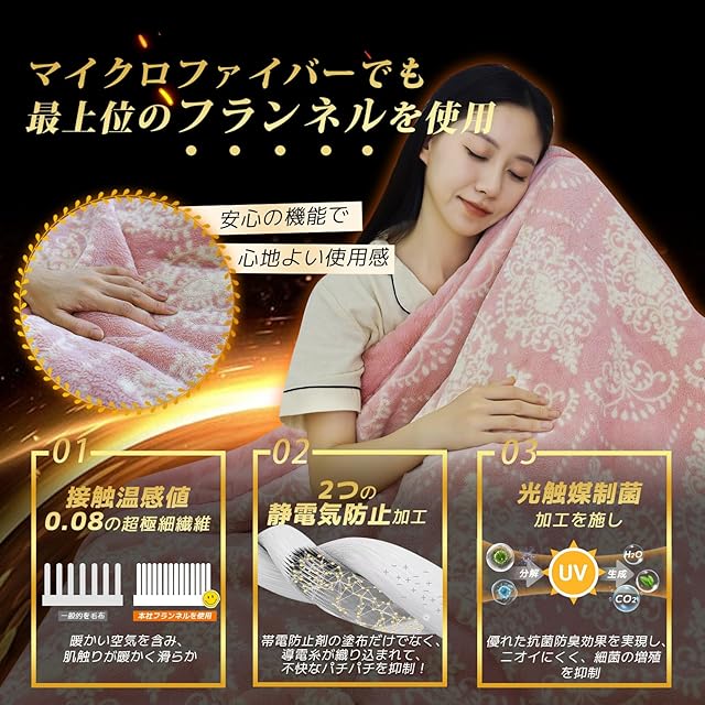 【接触温感・ダブル静電気防止効果】毛布の表裏地には、接触温感値0.08の「フランネル扁平糸」超極細繊維が使用されて、手触りが暖かく滑らかで、8mmの毛足によりたくさん暖かい空気を含み、温かい空気層を形成します。5cmごとに導電糸が生地に織り込まれて、静電気を効果的に除去します。さらに帯電防止剤加工が施されているため、ダブル静電気防止効果になり、乾燥した季節でも嫌いなパチパチから解放され、安心できます。