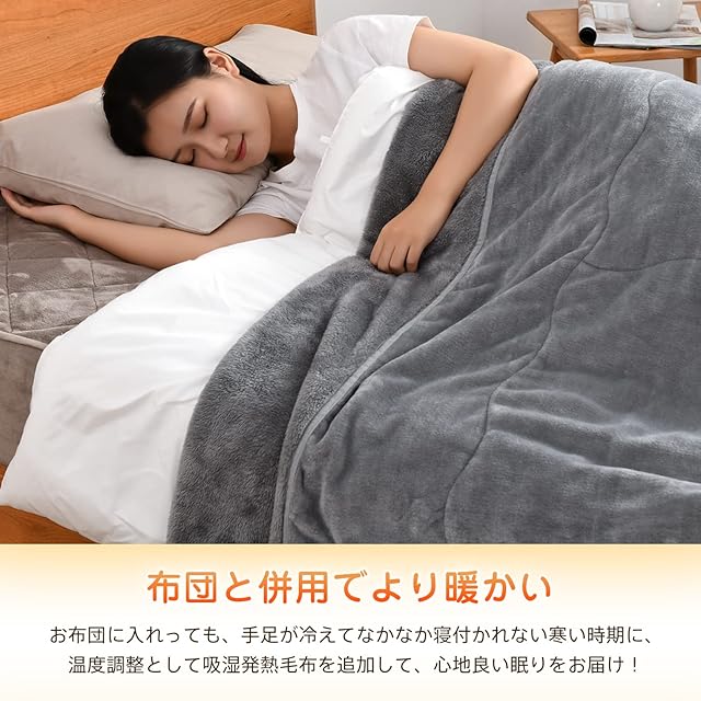 【サイズ・重量】ダブル・180X200cm/2.5kg 【素材】表生地:ポリエステル100%(フランネル)裏生地・えり部分:ポリエステル60%+レーヨン40%(吸湿発熱繊維)詰め物:ポリエステル100%(吸湿発熱加工わた入り)