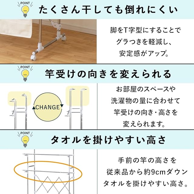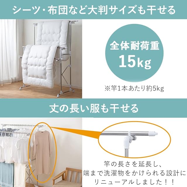 耐荷重:[全体]約15kg[竿1本あたり]約4kg[タオルハンガー1本あたり]約0.2kg(※耐荷重は測定値であり、値ではありません。)