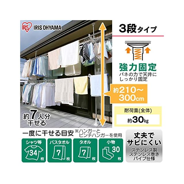 アイリスオーヤマ 洗濯物干し ベランダ 物干し 突っ張り ステンレス 高さ210-300㎝ SVI-300NR