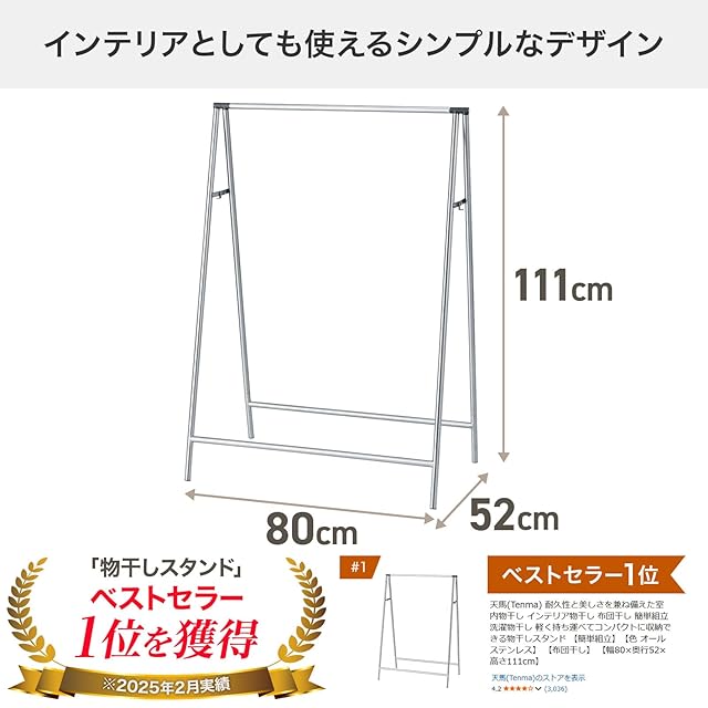 天馬(Tenma) 耐久性と美しさを兼ね備えた室内物干し インテリア物干し 布団干し 簡単組立 洗濯物干し 軽く持ち運べてコンパクトに収納できる物干しスタンド 【簡単組立】【色 オールステンレス】 【布団干し】 【幅80×奥行52×高さ111cm】