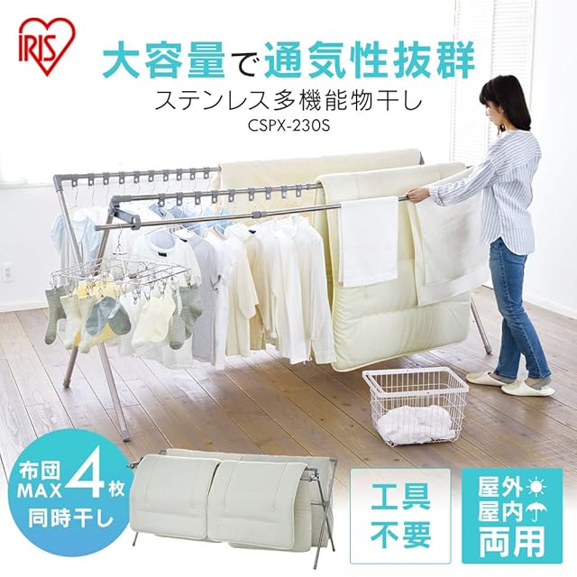 アイリスオーヤマ ステンレス鋼 物干し 布団も干せる 多機能 伸縮 布団4枚分 布団干し ダブルバー CSPX-230S 無地(ホワイト)
