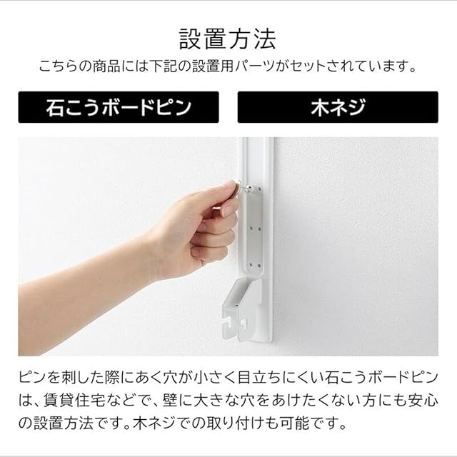 [付属品]石こうボードピンセット×16(取り付けピース×16 クギ×48)、木ネジ×8、ナット×8、六角レンチ、[仕様]生産国:中国、[取り付け可能な壁]石こうボードピン使用時:壁紙・布壁紙・ビニール壁紙貼りなどの石こうボード・薄ベニヤ、木ネジ使用時:柱・板壁(厚さ1cm 以上)・プリント合板(裏側に水平にサンがある場所)・裏に下地材(間柱)が入っている壁、※取り付けたい箇所に隣接する壁面が近い場合、5cm以上の隙間がないとご使用いただけません。※物干し竿・ポールは付属いたしません。
