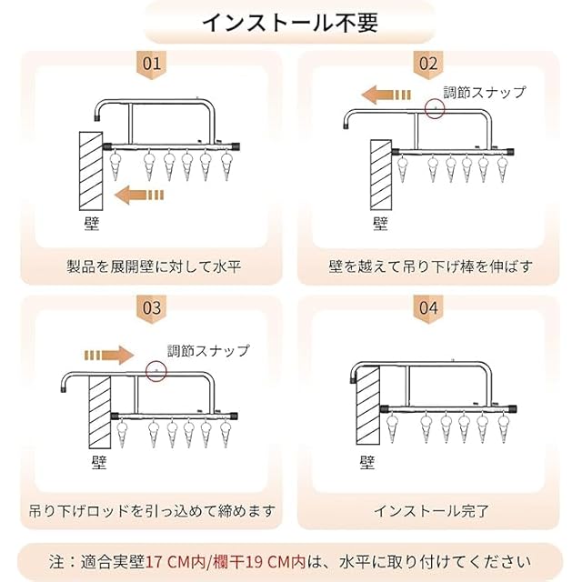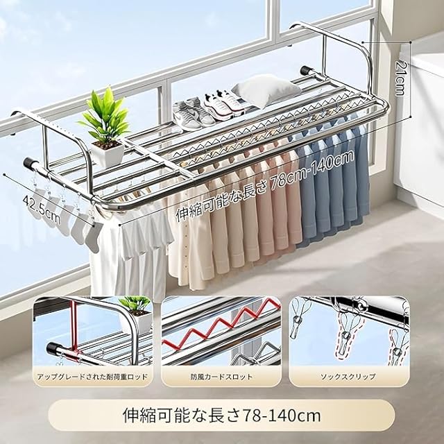 【伸縮自在で大容量物干し 】物干し竿は二重ケース構造を採用しており、必要に応じて自由に伸縮可能(78〜140cm)です。伸縮自在な設計で、物干し面積を自由に調節でき、衣類、タオル、バスタオル、マフラー、靴下、小物など幅広いアイテムの乾燥に使えます。防風クリップと靴下ホルダーが付属しているため、強風時でも安心して使用できます。