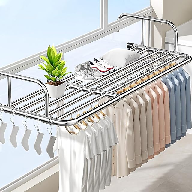 【多機能で実用的な物干し 】室内でも屋外でも使用できる多機能物干し竿で、衣類や靴を乾燥するだけでなく、浴室のタオル掛け、棚、植物棚としても使えます。軽量で携帯性が高く、穴を開ける必要がなく、さまざまな環境に適応しやすい設計です。ベランダ、手すり、窓際、洗濯室、ラジエーターなどに適しています。多用途物干しハンガーとして、日常生活を便利にします。