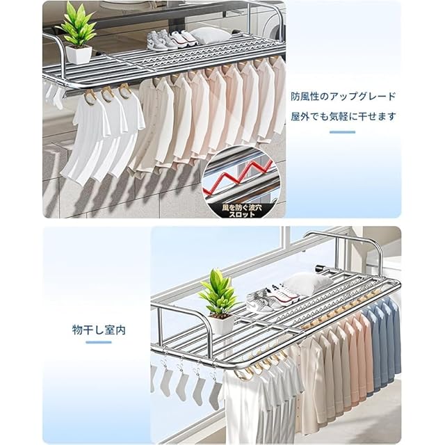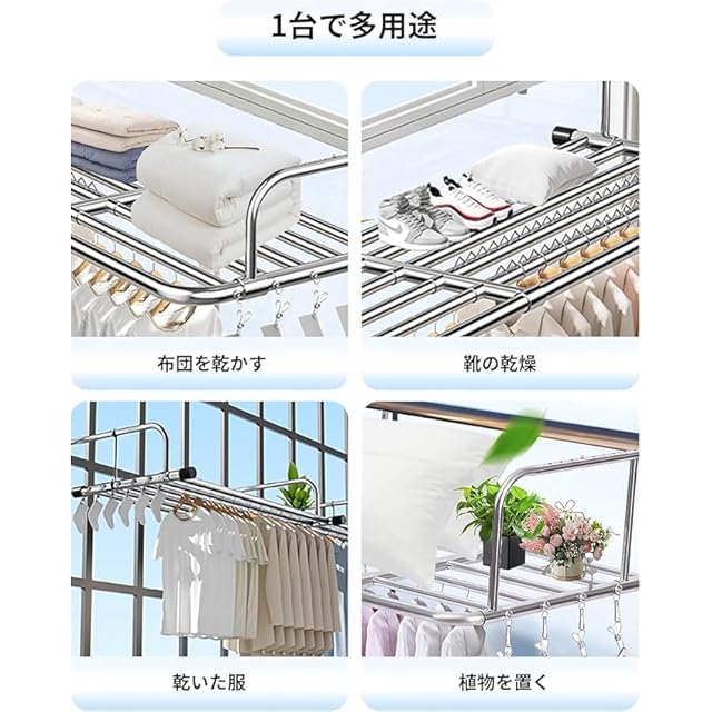 【高品質ステンレス材質 】新開発のサポートロッドを追加、安定性はもっと優れる。物干しハンガーは高品質のステンレス素材を使用しているため、耐傷性、耐高温性、防水性、防錆性に優れており、長期間の使用でも変形しにくい安定構造を実現しました。