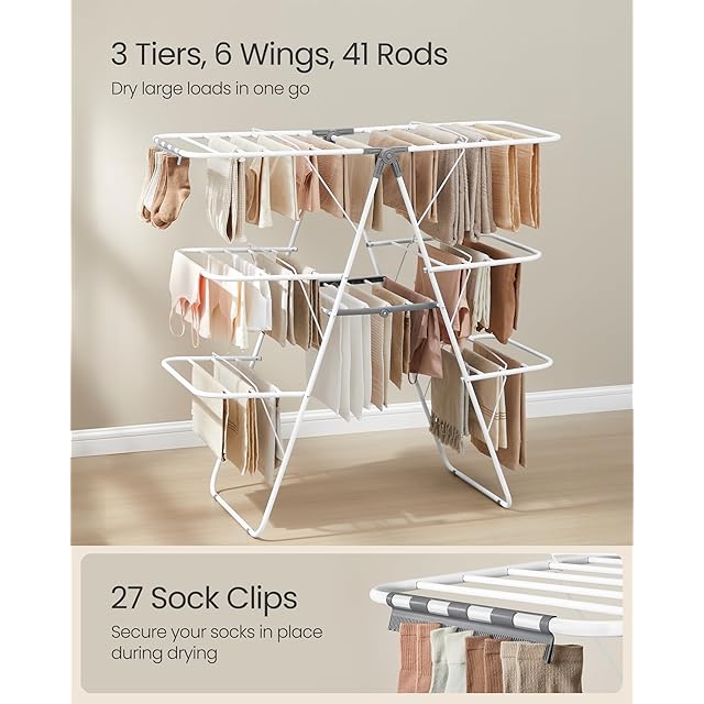【オールインワンの乾燥ソリューション】 41本のハンガーポールは、洋服、タオル、毛布などをたっぷり干すスペースを提供し、一度に大量の洗濯物を乾かす必要がある方方に最適です。27個のクリップは軽量のアイテムをしっかり固定し、地面に落ちるのを防ぎます。