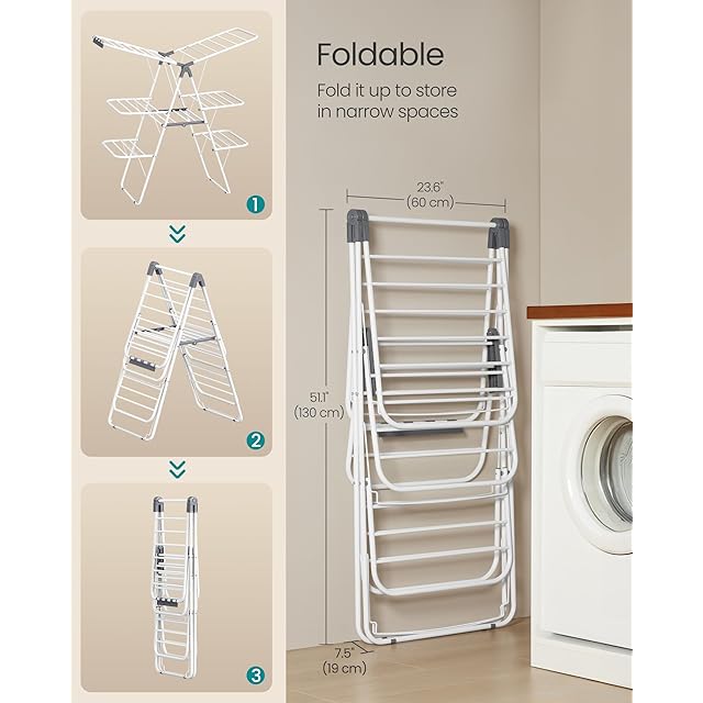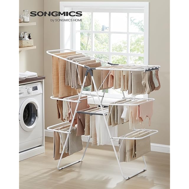 SONGMICS 物干しラック 室内 バタフライ式洗濯物干しスタンド 折りたためる 頑丈 高さ調節可能 幅126cm 組立不要 ホワイト+グレーLLR054W01