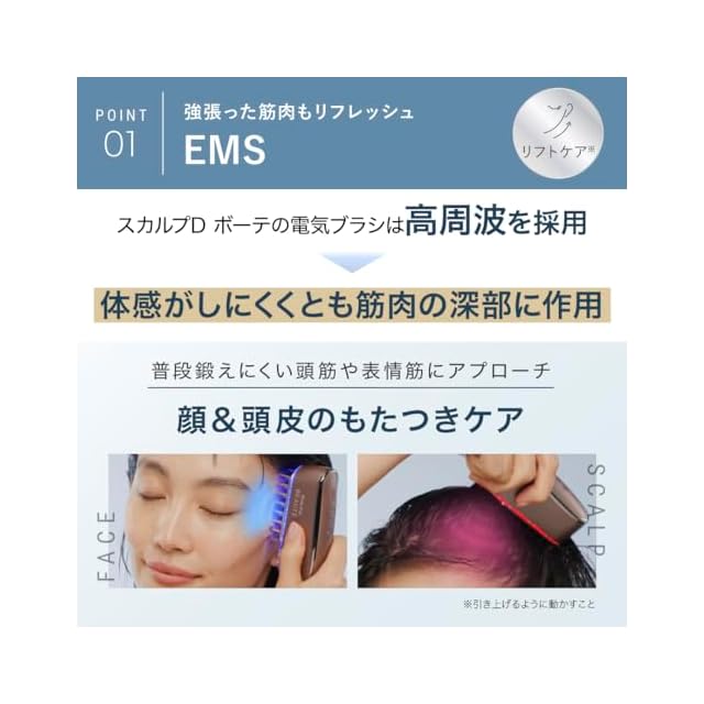 【強張った筋肉もEMSでリフレッシュ】 体感がしにくくとも筋肉の深部に作用する高周波を採用。 普段鍛えにくい頭筋や表情筋にアプローチし、顔&頭皮のもたつきをケア。