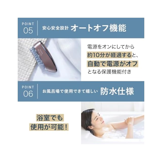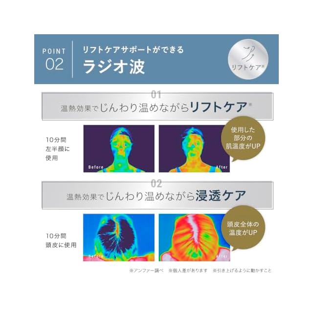 【じんわり温めるラジオ波でリフトケア(※2)】 温熱効果でじんわりと温め、リフトケア(※2)ができます。 また、肌にハリ・弾力を与えながら、くすみのない明るい美肌へ。 さらに、水分に反応する高周波で、ヘアトリートメントのうるおい成分の浸透(※3)を促し、健やかな頭皮へ導きます。