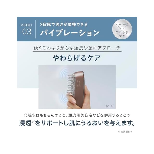 【バイブレーションでやわらぎケア】 毎分約5,000回以上の振動で1分間に合計約140,000回肌を優しくタッピングし、頭皮・顔など硬くなった肌を柔らげます。 また、化粧水はもちろんのこと、頭皮用美容液などを併用することで浸透(※3)をサポートし肌にうるおいを与えます。