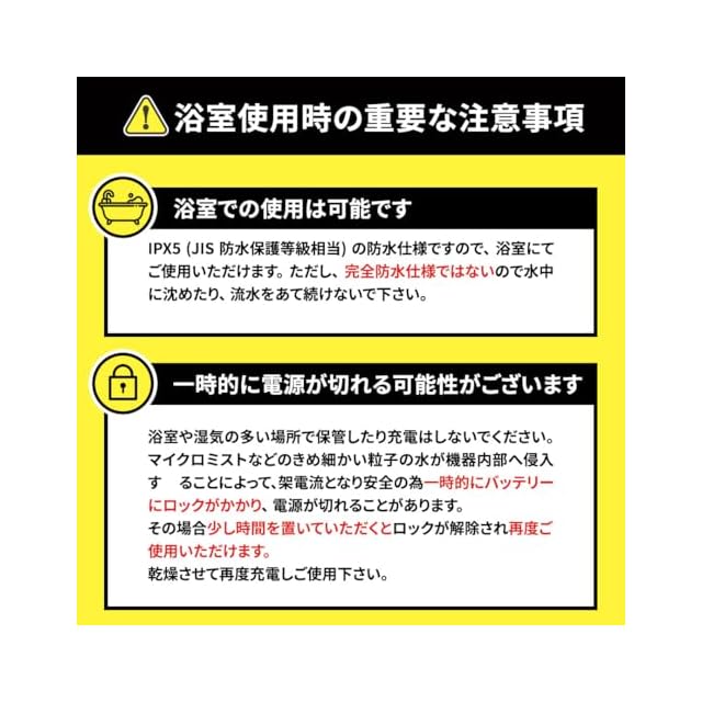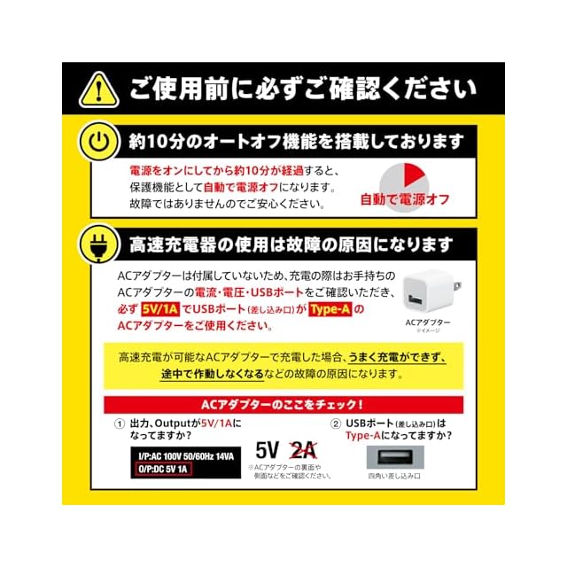 【必ずご確認ください】 ●電源をオンにしてから約10分が経過すると、自動で電源がオフになります。 故障ではございませんのでご安心ください。●高速充電器などを使用した場合、正常に充電ができず、故障の原因となります。ACアダプターは付属していないため、充電の際は、お手持ちのACアダプターの電流と電圧をご確認いただき、 必ず「5V/1A」でUSBポートがType-AのACアダプターをご使用ください。(※ご注意※「5V/2A」は高速充電器となります。ご注意ください。)●必ず本体の水分を拭き取り、完全に乾燥した状態で充電してください。万が一USB充電口に水滴などが残ったまま充電すると、故障の原因となります。●初めての充電や長期間使用しない状態が続いた後に充電する場合、満充電でも動作時間が短い場合があります。その場合は、再度充電してから使用してください。 ●IPX5(JIS 防水保護等級相当)の防水仕様です。※完全防水仕様ではありません。●浴室での使用は可能ですが、水中に沈めたり、流水をあて続けないでください。 また、浴室や湿気の多い場所で保管したり充電はしないでください。マイクロミストなどのきめ細かい粒子の水が機器内部へ侵入することによって、架電流となり安全の為バッテリーにロックが一時的にかかり、電源が切れることがあります。その場合少し時間を置いていただくとロックが解除され再度ご使用いただけます。乾燥させて再度充電しご使用ください。