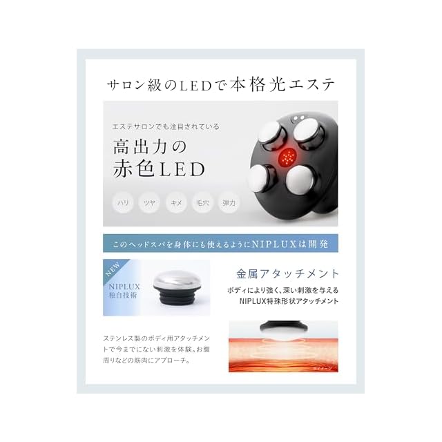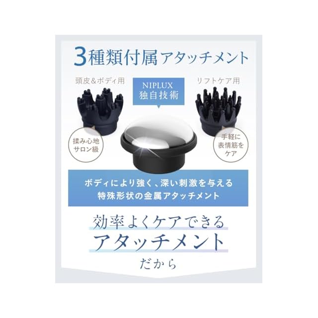 【サロンよりお得!多機能ヘッドスパ】ヘッドスパの気持ちよさをボディにも体験してほしいから。ボディを効率よくケアできる金属アタッチメントを開発しました。金属アタッチメントボディにより強く、深い刺激を与えるNIPLUX特殊形状アタッチメント、ステンレス製のボディ用アタッチメントで今までにない刺激を体験。お腹周りなどの筋肉にアプローチします。