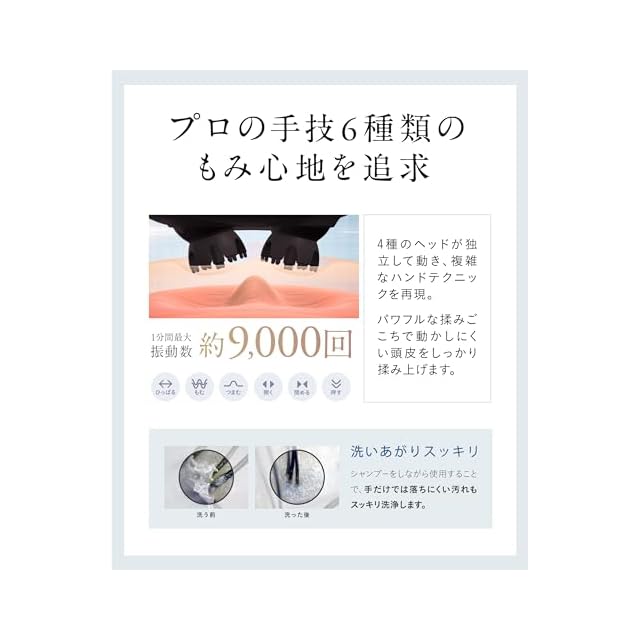 【プロの手技6種類のもみ心地を追求】4種のヘッドが独立して動き、複雑なハンドテクニックを再現。パワフルなもみ心地で動かしにくい頭皮をしっかり揉み上げます。4 種類の回転モードがあり、お好みの速度と振動でしっかり揉みこみ、硬くなった頭皮を柔らかな地肌へと導きます。