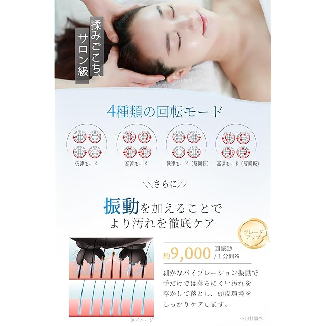 【プロの技術を再現したEMSヘッドスパ】4種類の回転モードと6種類の動きは、まるでプロの手技を体感しているかのような心地よい頭皮エステをご自宅でお楽しみいただけます。さらに、振動機能を加え、頭皮の毛穴汚れを浮かせ、心地よく叩いて落とします。1分間に約9000回の振動で、シャンプーしながらご使用いただくことで、手だけでは落ちにくい汚れもスッキリ洗浄され、柔らかな地肌へと導かれます。