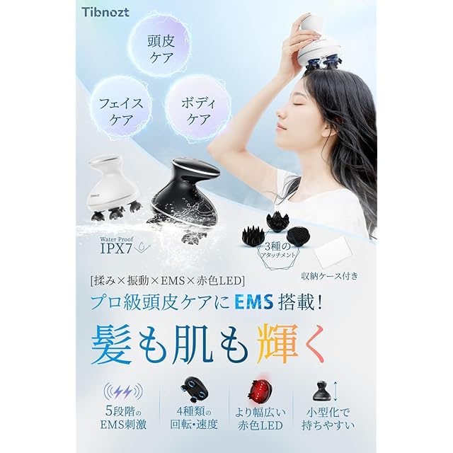 Tibnozt EMS ヘッドスパ 電動頭皮ブラシ【敬老の日】頭皮エステ スカルプケア フェイスケア 美容家電 IPX7防水 3D振動 広範囲赤色LED 収納ケース付き コードレス 小型化 静音 お風呂 乾湿両用 全身適用 クリスマス プレゼント ギフト 誕生日 母の日 ブラック