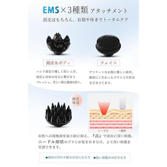 【3種アタッチメント&収納ケース】◎頭皮専用ニードルタイプ:肌への接触面を最小限に抑え、『点』で頭皮に深い刺激。ニードル形状のプラシが髪をかき分け、より深い刺激を実感できます。◎頭皮&ボディ用:ハンド感覚で優しく洗い上げ、頭皮と身体の両方を贅沢にリフレッシュ。◎フェイス用:デリケートなお顔に優しい素材、細部にこだわったブラシで自然美を引き立てます。(全てのアタッチメントでEMS機能利用可能。)また、お客様のご要望を応じて、アタッチメントの収納ケースも同梱されています。