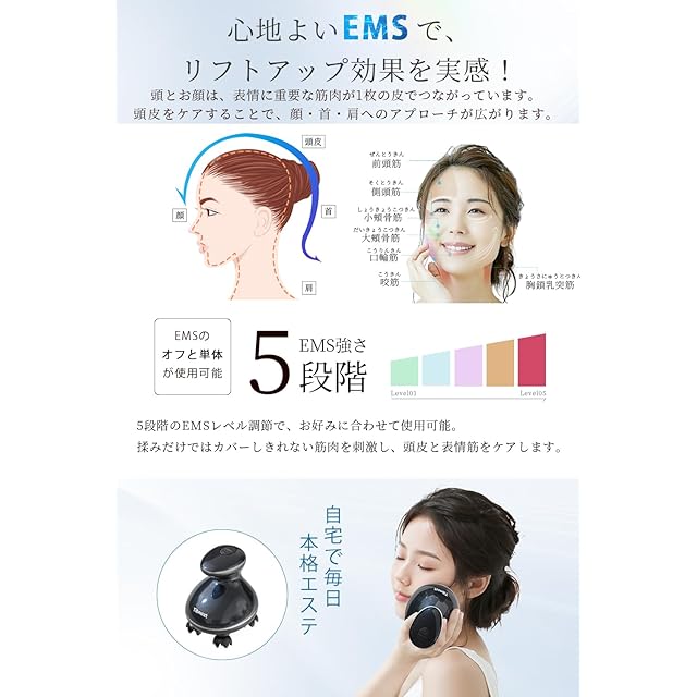 【頭皮の硬さをEMSで改善!グレードアップ効果を実感しよう~】5段階のEMSレベル調節で、お好みに合わせて使用可能。揉みだけではカバーしきれない筋肉を刺激し、頭皮と表情筋をケアします。※EMSのオフと単体が使用可能。※EMSをご使用の際は、水や化粧水で使用部位を湿らせてからお使いください。EMSを初めて使用する時や慣れるまでは、レベル1からご使用ください。