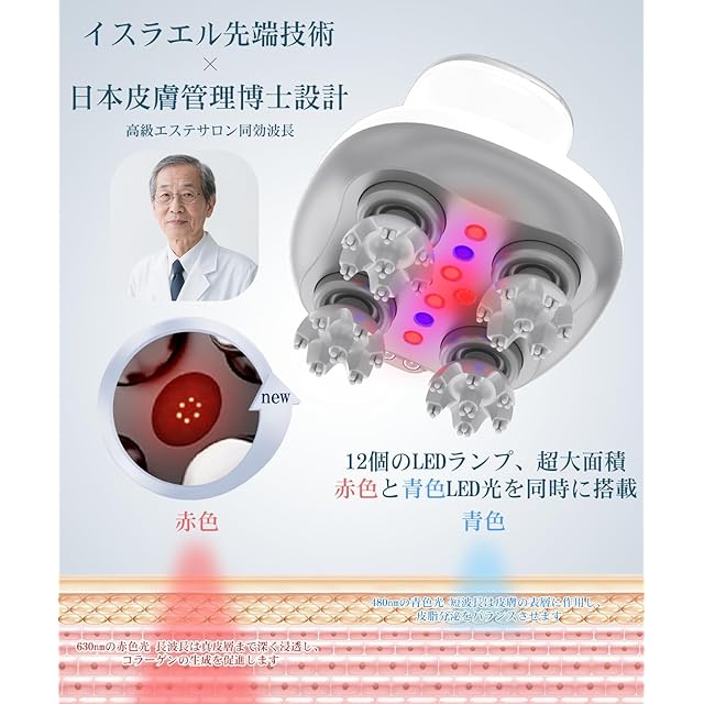 【630nm赤光×480nm青光·ダブル美容光 美顔器】AQielev電動頭皮ブラシ専用の630nmの深層浸透赤光が肌奥までしっかり届き、ふっくらとしたハリ感をサポート。480nmの表面スパ青光がべたつきやつっぱり感を整え、すっきりとした肌状態へ導きます。「赤のみ」「青のみ」「赤青ミックス」の 3 モードで 12 個の高品質美容光がお顔から頭皮までまんべんなく光スパ。ヘッドスパとエステサロン仕様の光技術で、頭皮とお肌のトータルビューティスパ を実現します