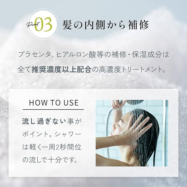 【高濃度トリートメントで内側からしっかり補修】BRACEのトリートメントは、プラセンタやヒアルロン酸などの高濃度の補修成分を配合。髪の内側からしっかりと補修し、乾燥や広がりを防いで、しっとりまとまる美髪へと導きます。