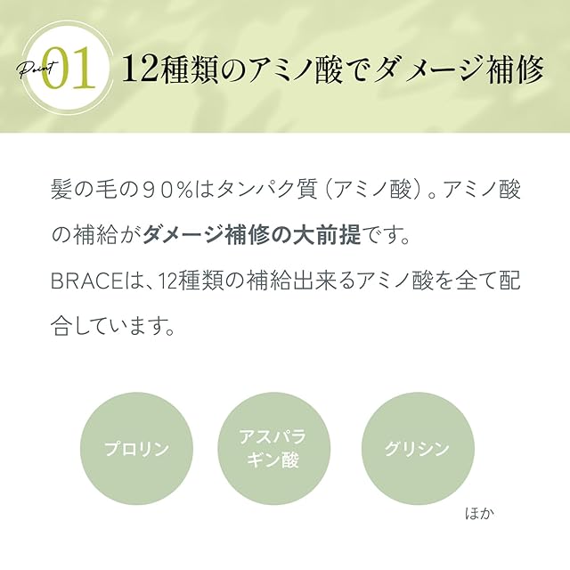 【12種類のアミノ酸で、髪を内側からケア】BRACEのシャンプーは、プロリン、アスパラギン酸、グリシンをはじめ、12種類のアミノ酸を贅沢に配合。これにより、髪のダメージを補修し、ツヤやハリを与え、髪質改善とダメージケアを同時に叶えます。