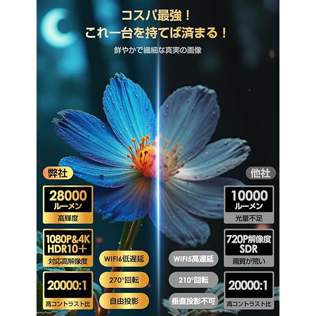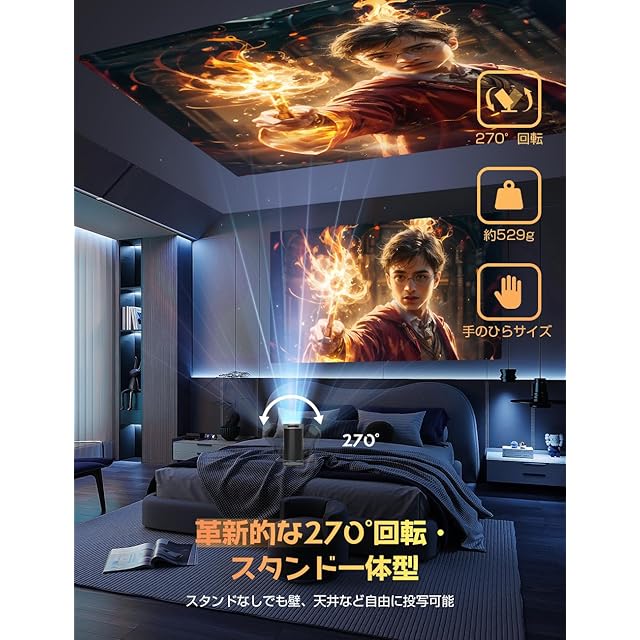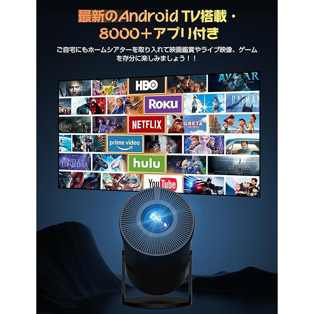 商品名:プロジェクター 家庭用【2025年新登場!28000LM・270°回転・4K対応・最新Android TV搭載】1080P プロジェクター 天井投影 Wi-Fi6瞬間接続 50%ズーム機能 自動台形補正 Bluetooth ホームプロジェクター 小型 高輝度 短距離投影 軽量 スマホ/パソコン/PS機/DVD接続可 スタンド一体型 プレゼント 三年期間 日本語取扱説明書