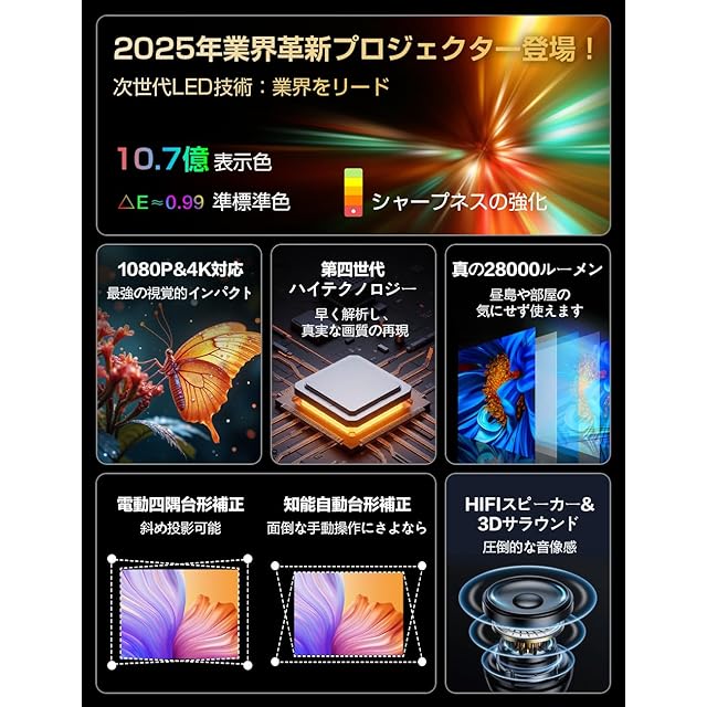 ✨【色再現1080P・4K対応・白い壁に直接投影可能】ホームプロジェクターの明るさは28000ルーメンに向上し、ネイティブ解像度は1080Pにアップグレードされ、NTSC色域の95%以上をカバーし、色再現性が高く、投影された画像は鮮明で、元の色に近くなります。プロジェクターはスクリーンなしで白い壁に直接投影することができ、自然な形で詳細な色を再現し、美しい画像を楽しむことができます。優れた12,000:1のコントラスト比を最大限に引き出します。4Kソースも兼用して、綺麗な再生が楽しめます