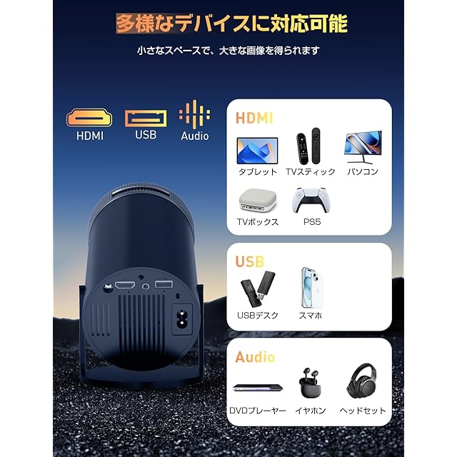 ✨【多彩な互換性・Fire TV Stick応対・スマホ無線ミラーリング】この家庭用プロジェクターはWi-Fi、Bluetooth接続以外に、HDMI、USB端子が搭載しており、ノートパソコン/スマホ/TVボックス/DVDプレーヤー/USBメモリー/Google Chrome cast/X-Box/PS3/PS4など様々な周辺機器に接続できます。※注意:このプロジェクターはGoogle Pixelと互換性がありません。また、一部のAndroid端末(AQUOS)には画面ミラーリング機能が搭載されていないため、プロジェクターに接続できない場合がありますので、お使いの携帯電話に画面ミラーリング機能があるかどうかをご確認ください。
