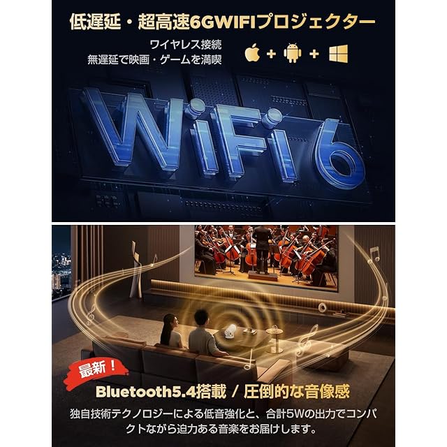 ✨【Wi-Fi 6安定信号伝送・Bluetooth5.3・臨場感あふれるHiFiスピーカー】独自開発された高精度チップ技術を使用してある本小型プロジェクターは、2.4G+5Gの周波数帯を同時利用でき、安定した信号と高い伝送速度を備えた超高速 6G WiFi 接続テクノロジーも備えています。 iOS、Android、Windows デバイス (ミラーリング対応のスマートフォン、タブレット、コンピューターなど) を Wi-Fi 経由ですばやく接続し、非常にスムーズで遅延のないオンライン ゲーム、映画鑑賞、ビデオ体験を簡単に楽しめます。Bluetooth 5.3と高品質 HiFi スピーカーが内蔵しており、お気に入りのBluetoothスピーカー、DVDプレーヤーやワイヤレス ヘッドフォンからオーディオをストリーミングすることができ、臨場感あふれる立体的なサウンドで圧倒的な没入感を味わえ、自分ための空間づくりにします。