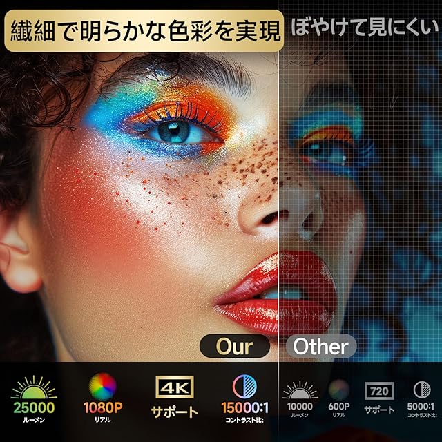 【明るさプラス、25000LM高輝度&4Kサポート& リアル1080P】JOWLURKホームプロジェクターA20は独自の技術が搭載されており、18000ルーメン高輝度を備え、リアル1080P高解像度にアップグレードし、また15000:1の高コントラスト比まであげて、従来のプロジェクターより95%以上の明るさとより高い鮮明さを提供し、4Kソースも兼用して、画像と動画本来の鮮明さと色を最大限に再現します!より現実感のあるリアルな映像を映し出します。白い壁に直接に投影しても、自然な色再現の美しい映像をお楽しみ、スクリーンがなくても大丈夫です。また、拡散反射の原理でテレビの直射光より小型プロジェクターの拡散光源がもっと柔らかくて、視覚的に楽しみながら目をしっかり守ることができます。
