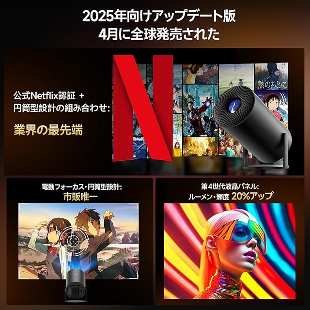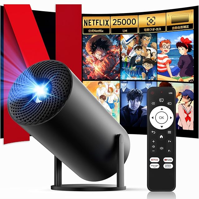 【2025年8月本格発売! 業界初公式Netflix認証済】JOWLURK円筒プロジェクターA20はお客様のご意見を集めて、Netflix公式ライセンスを取得、市販初の公式Netflixライセンスの円筒プロジェクターになりました!従来のAndroid海賊版システムより、複雑なバージョン要件がないため、クラッシュ、起動不可、Netflixサインイン不可などの問題が一切なし!いつか問題が出る心配がせず、内蔵したYoutube・Disney+・Prime video・huluと一緒、Fire TV stickがなくても映画館ように滑らかな大画面を自宅で簡単に楽しめます!更に、スマホの小画面で止まっていたのを補い、My appのウェブページでtiktokなどのほかのアプリのショートムービーを大きな画面で体験できます!【限定期間キャンペーン】今ご注文いただくと、すぐ「100インチスクリーン」がもらえる!お気軽に説明書の連絡先より弊社までご応募してください!