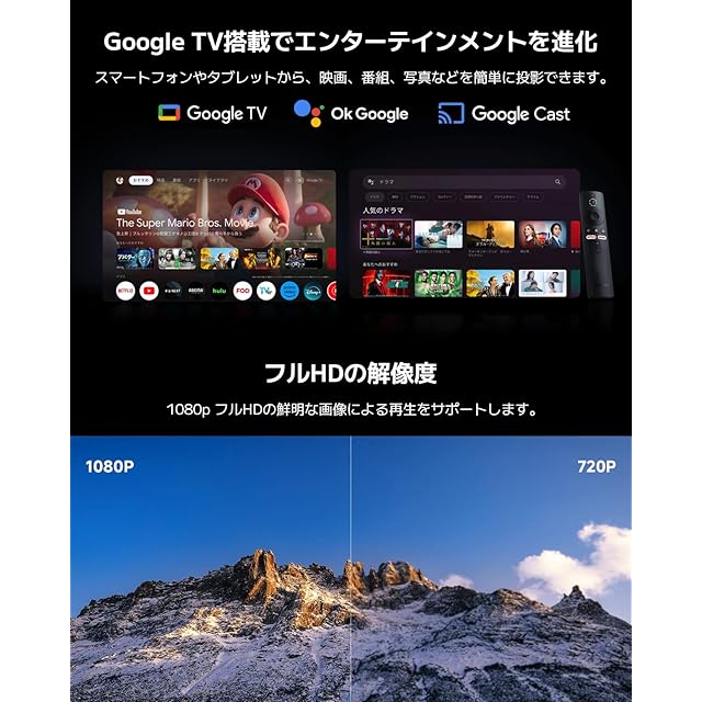 ✅Google TVの搭載:お気に入りのエンターテインメントを最大限に楽しむことができます。音楽や動画の検索、アプリのストリーミング、プロジェクターの操作などを、Googleアシスタントに音声で指示できます。