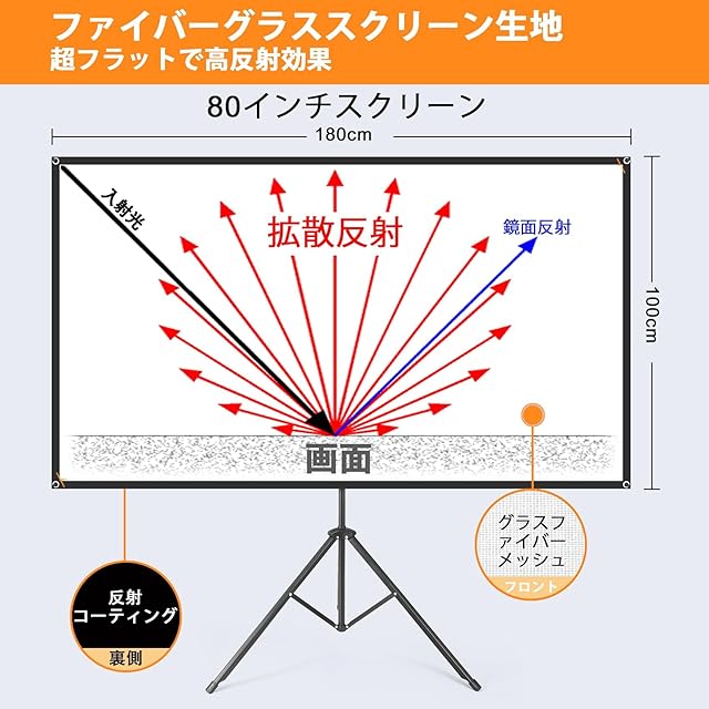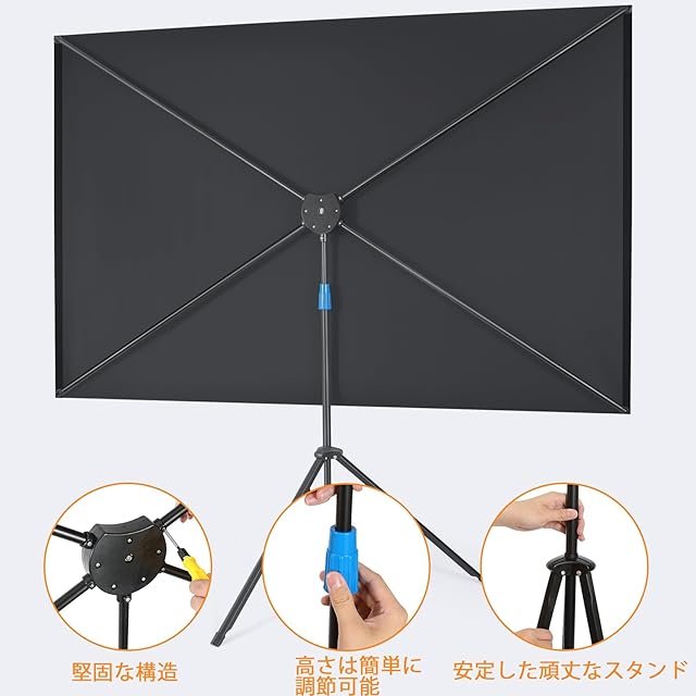 洗える大型スクリーン: 洗える 100 インチのポリエステル生地スクリーンで、鮮明で鮮やかなビジュアルをお楽しみください。 高密度で厚みのある素材により、16:9のアスペクト比と160°の広い視野角で鮮明で明るい投影がされ、庭、寝室、ホームシアター、教室、会議室、キャンプなどで多用途に使用できます。