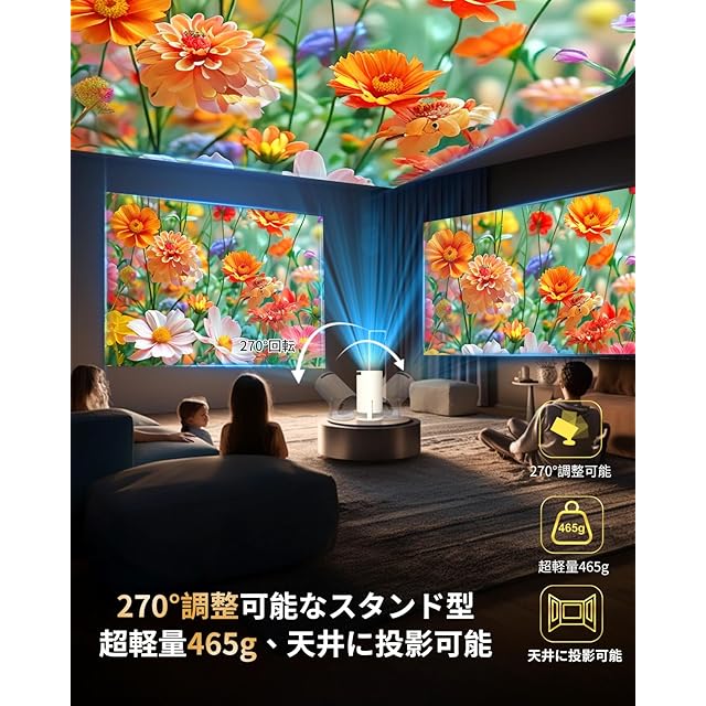 プロジェクター 小型【2025 Android TV搭載・18000LM・4K対応・270°回転】 静音 1080P 高輝度 50%ズーム機能 天井投影 5GWIFI Bluetooth5.4 projector 短距離投影プロジェクター 小型 ホームプロジェクター スタンド一体型 内蔵HiFiスピーカー 自動台形補正 スマホ/ノートパソコン/DVD/Switch/などに対応