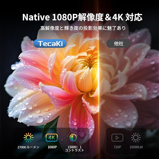 ✨【27000LMの高輝度・ネイティブ1080P & 4K対応】どんな環境でもプロ並みのクリアな映像を実現!従来モデルを超える驚異的な明るさで、日中や明るいリビングでもくっきり表示。映画の暗いシーンやゲームの細部まで、鮮やかに再現します。ネイティブフルHD(1920×1080)解像度に加え、4Kコンテンツも高精細でスムーズに表示。ビジネスプレゼンも、自宅での映画鑑賞も、精細で臨場感あふれる画質が楽しめます。さらにHDR10対応で、幅広いダイナミックレンジと豊かな色彩表現を実現。くっきり・なめらか・色鮮やか――全てがひとつになった、極上の視覚体験をお届けします。