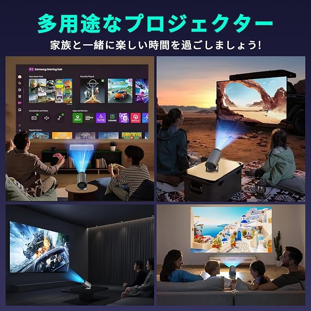 【最新Android TV 12搭載・天井投影・270°回転】プロジェクター にはAndroid TVが内蔵されており、Wi-Fiに接続すると、Prime Video、YouTube、Netflix 、Disneyなどの8,000 以上のアプリから 500,000 本以上の映画やテレビ エピソードを楽しめます。要件に応じて Google PlayストアやApp Store から豊富なアプリをダウンロードできて、TVスティックを別途購入や複雑な設定は一切不要です。プロジェクター 家庭用 は270°自由に回転できる一体型デザインを採用しており、三脚を使用せずに自由に投影角度を選択で、設置場所や角度にとらわれません。小型 プロジェクター は壁や天井に投影でき、座っていても、寝転んでも、横になっても、楽な視聴体験を楽しめます。生活のあらゆる場面で自由に活用できます。