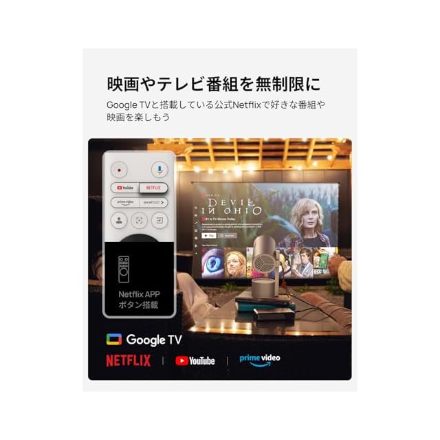 Netflix公式ライセンス取得のGoogle TV: Netflixを標準搭載し、簡単にアプリ起動ができるほか、おすすめのコンテンツ、動画視聴など操作性と見やすさがさらに向上しました。10,000以上のアプリと800を超える無料チャンネルを提供し、お好みの映画や番組、ライブ配信など、すべてを大画面で楽しめます。