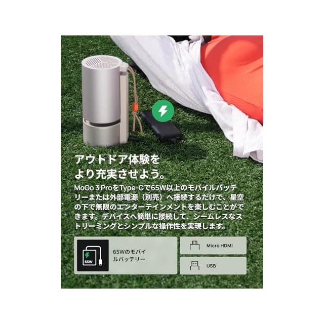 Type-C電源とシームレスなApple/Android接続: MoGo 3 ProをType-C端子経由で65W以上のモバイルバッテリーまたは外部電源(別売)に接続するだけで、無限のエンターテイメントをお楽しみいただけます。iPhoneやAndroidデバイスと簡単に接続でき、シームレスなストリーミングとシンプルな操作性を実現します。複数の入力ポートにより、接続もスムーズです。