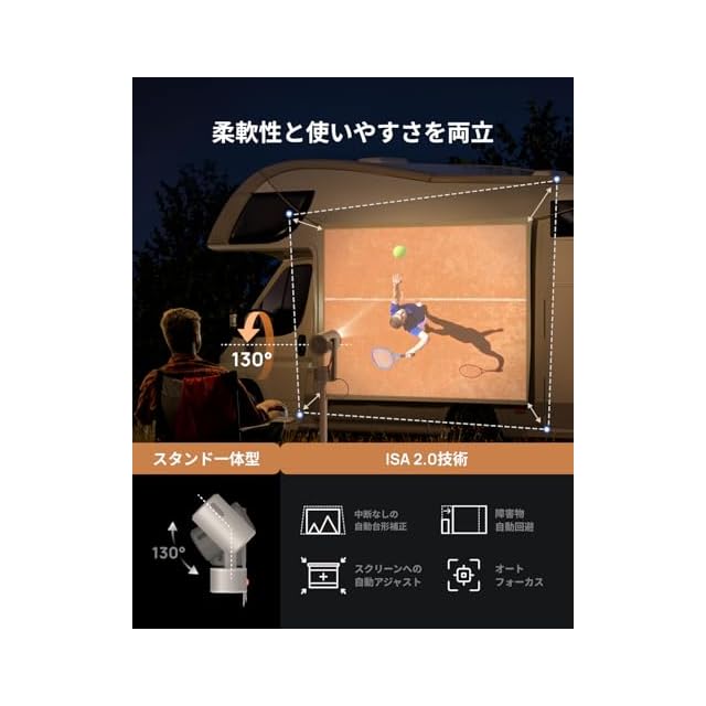 完璧な位置合わせを実現する 130° 調整可能なスタンド一体型とISA 2.0技術: 130° 調整可能なスタンド一体型とISA 2.0技術を備えた MoGo 3 Pro は、どの角度からでも自動的に調整され、完璧に整列した画像をします。金属製のスライド レールで安定した途切れない視聴を楽しみ、スマートなデザインでレンズを保護します