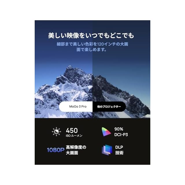 450 ISO ルーメンによる驚異的な1080Pの解像度: 鮮やかなテレビ品質の映像をどこでも体験できます。450 ISOルーメンの輝度、90%のDCI-P3色域、1080Pの解像度で、細部まで美しい色彩を120インチの大画面で楽しめます。